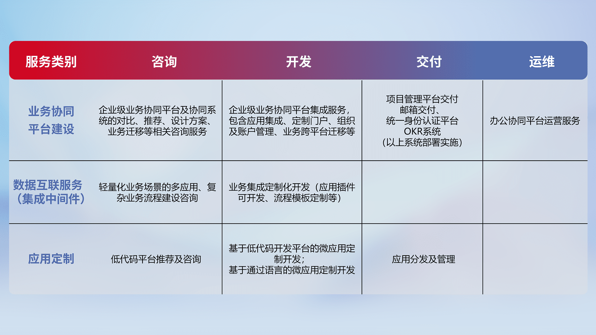 针对钉钉、、、、企微、、、、IDaas等平台级产品提供产品的规划、、、方案、、、交付、、、、定制化开发等服务,,,,实现如统一协同办公、、、、智能客户服务、、、、混合会议管理、、、智能数据查询、、、等业务场景,,,,实现数字化转型。。。