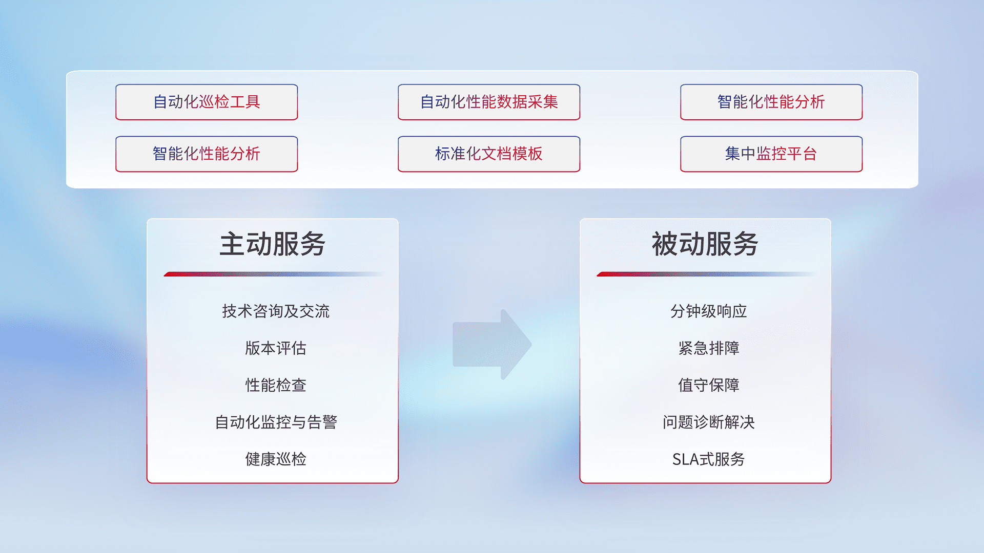 智能化工具和标准化文档,,,,保障服务质量,,,,提供主动服务(包含技术咨询、、版本评估、、、性能检查、、、、自动化监控与告警、、、健康巡检)和被动服务包含(分钟级响应、、紧急排障、、、、值守保障、、、、问题诊断解决、、、、SLA服务)。。。。